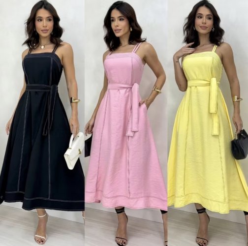 VESTIDO MIDI FEMININO Com CINTO FAIXA e BOLSOS - MODA ELEGANTE